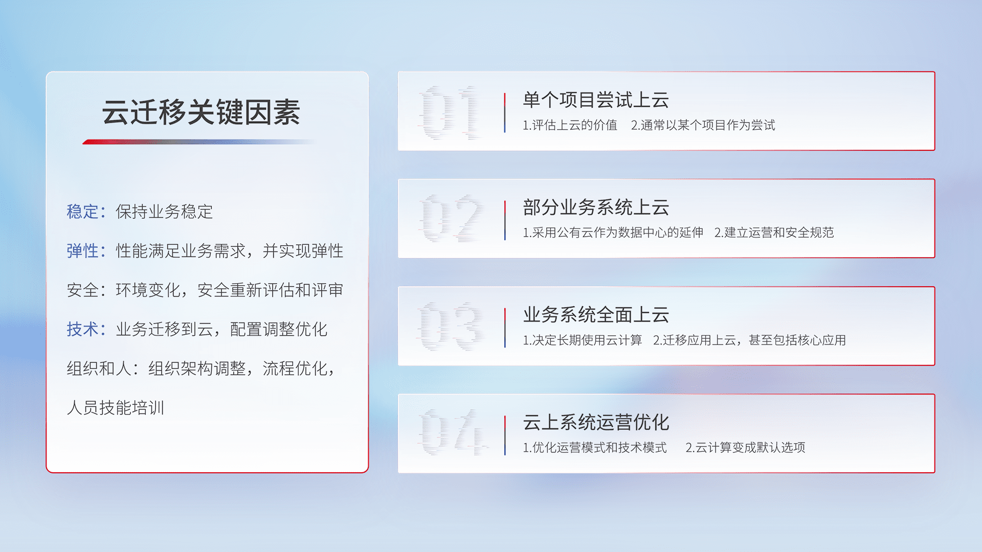 结合实际业务,,从规划设计、、、、云平台选型、、、、云原生改造、、、、数据迁移、、集成交付,,,迁移全过程为客户识别最佳上云路径,,,做好风险识别管理,,,,设计网络架构、、、身份权限、、安全审计合规、、操作审计、、、、日志审计、、监控告警策略、、多站点容灾设计等,,,,对云上基础设施进行整体规划,,,,提升IT治理水平,,,,以满足弹性、、、高可用、、、、高性能的需求。。。。